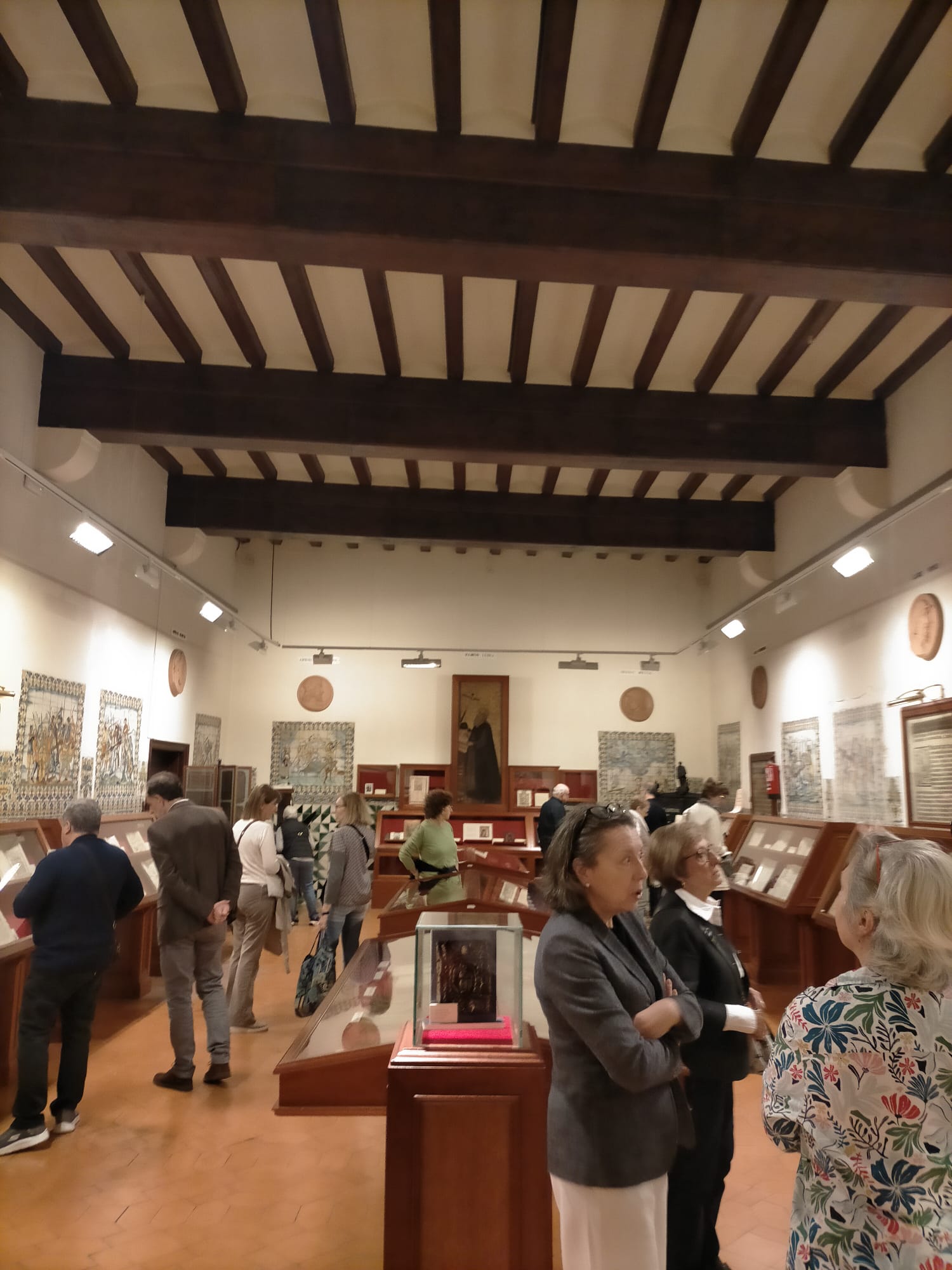 La primera sala, decorada con azulejos, alberga actualmente el “Museu del Llibre de Frederic Marès”. Contiene la colección de libros y material bibliográfico donada por Frederic Marès en 1986. Como nota curiosa, cuando esta sala era parte del hospital, fue allí donde ingresaron a Gaudí tras el atropello que le causó la muerte. La segunda sala, que también formó parte del hospital, contiene un magnífico tapiz que nos sorprendió por su tamaño y detalle.Por último, visitamos una de las salas más destacadas de la Biblioteca: la Sala Cervantina. Dicha sala contiene exclusivamente obras de Cervantes. La primera colección fue donada por el Sr. Isidre Bonsoms Sicart y constaba de más de 3.000 ejemplares. Actualmente, la Biblioteca dispone de más de 9.000. Como curiosidad, cabe mencionar que albergan un ejemplar de la primera edición del Quijote (1605), así como traducciones de la obra a más de 50 idiomas.